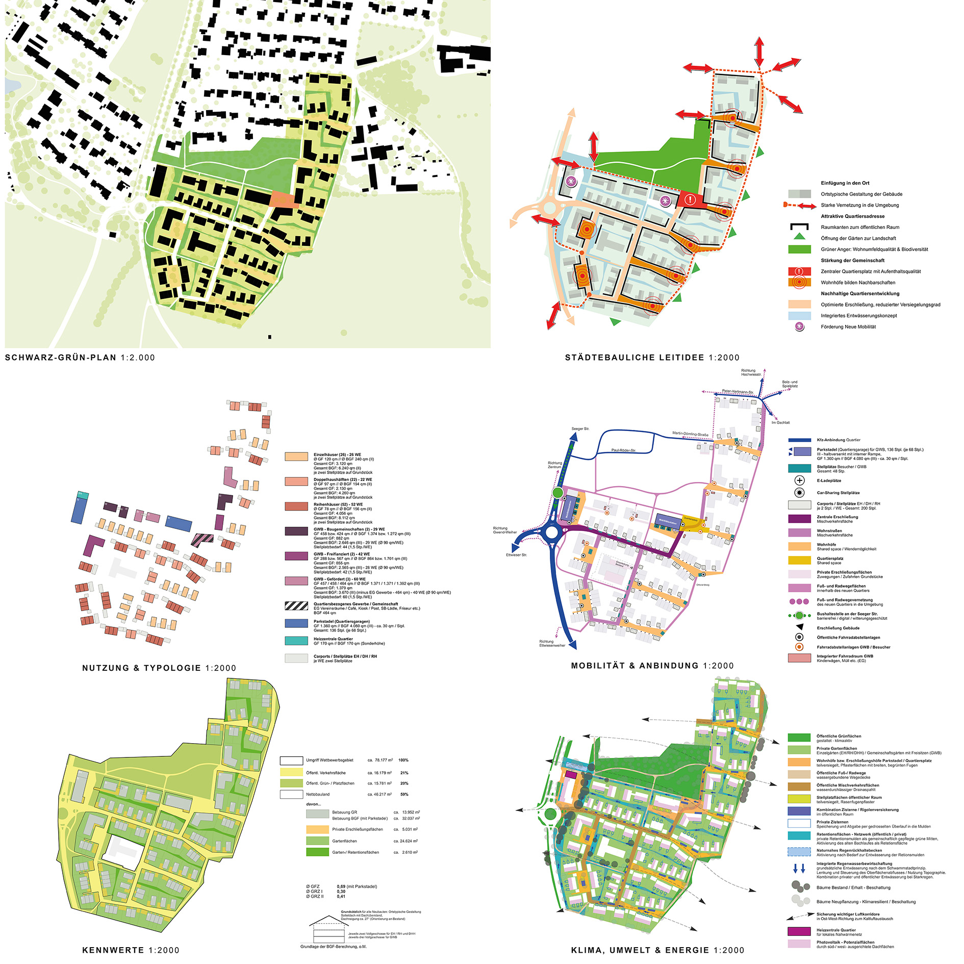 Die städtebauliche Grundstruktur gewährleistet sowohl eine kleinteilige abschnittsweise Realisierung als auch eine harmonische Einbindung jedes Entwicklungsabschnitts in das räumliche Ortsgefüge. Ein differenziertes Angebot an Wegen und Höfen bietet attraktive Möglichkeiten des Aufenthalts im Freien und stellt die Verknüpfung zum Ort bzw. in die Landschaft dar.