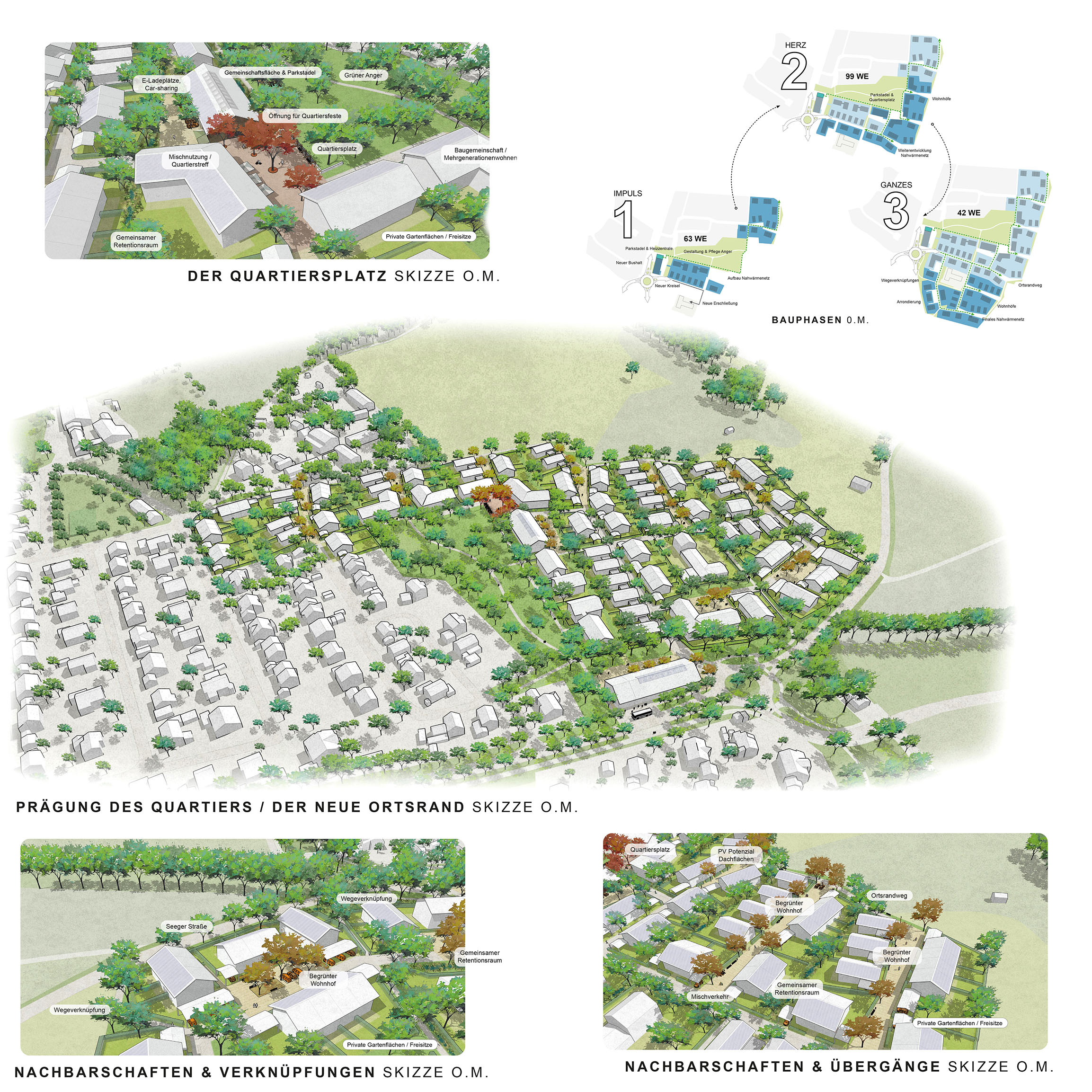 Der neue Ortsrand setzt sich dabei aus Segmenten unterschiedlicher Wohnhöfe zusammen, welche über eine Abfolge von Wohnstraßen und Aufenthaltsbereichen an das örtliche Erschließungsnetz angebunden sind. Der Wohnhof als gemeinschaftsbildende Typologie bietet günstige Voraussetzungen für nachbarschaftliches Wohnen. Ebenso stärkt der zentral gelegene Quartiersplatz mit ergänzenden Nutzungen und einer hohen Aufenthaltsqualität das Gemeinschaftsgefühl in der Siedlung.